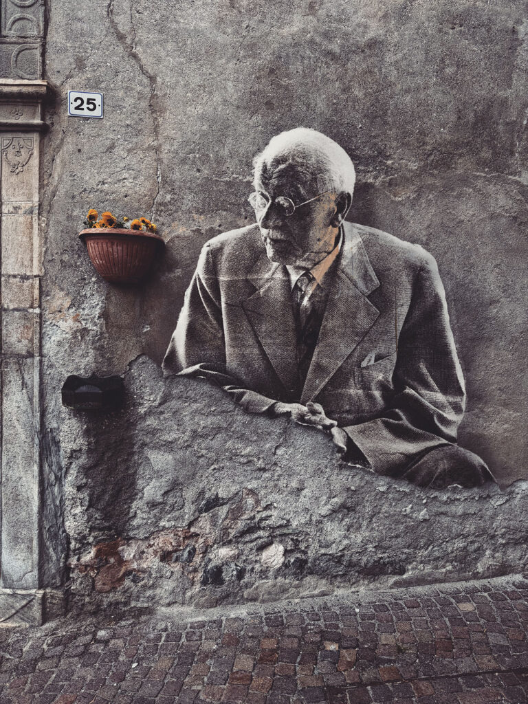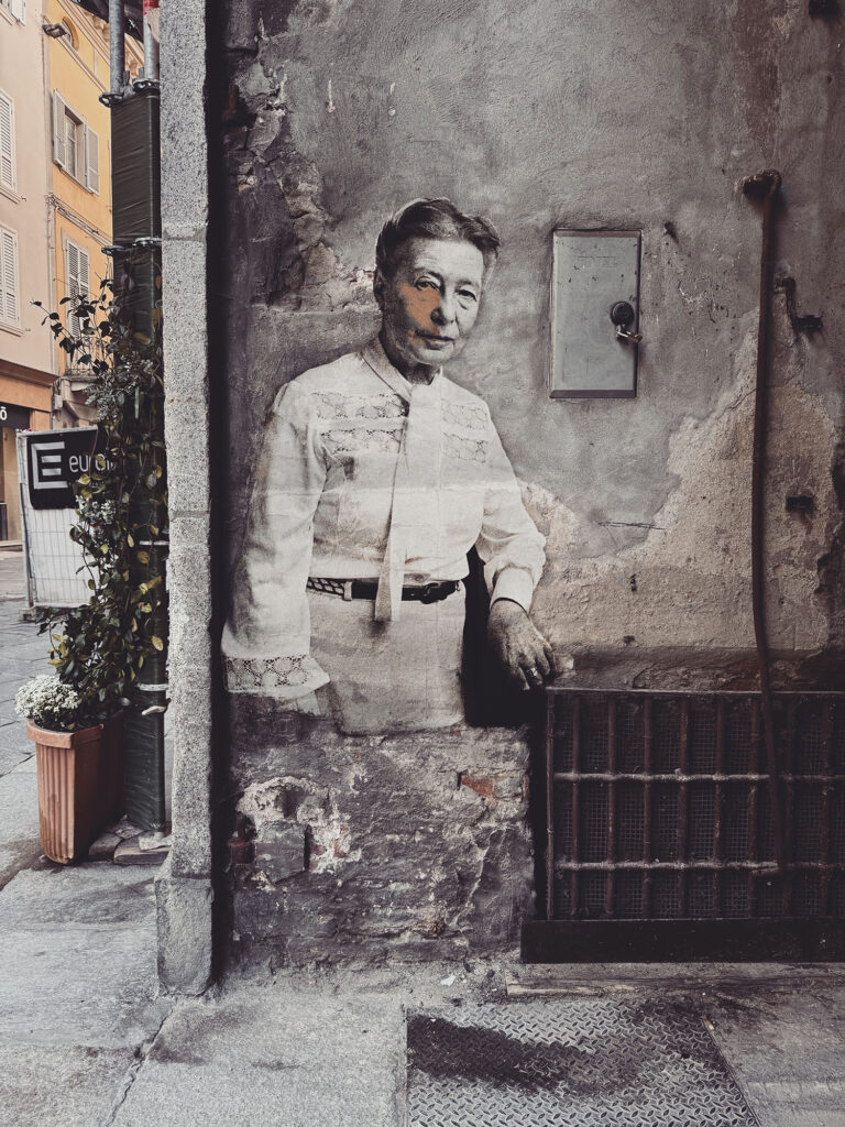 Beast installs these works almost exclusively in abandoned historical centers—places emptied by time, economics, migration, neglect. No foot traffic. No advertising. No curatorial panels explaining what you’re supposed to think. And that’s the point. Abandoned places don’t compete for attention. They don’t sell anything. They don’t perform. When a figure like Jung or de Beauvoir appears there, the encounter feels intimate, almost private. You’re not consuming an artwork. You’re stumbling into it. The wall already carries history. The artwork doesn’t overwrite it. It collaborates with it.