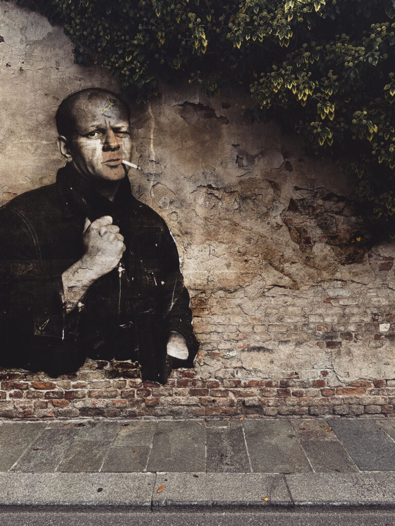 So far, the series has featured around a dozen historical figures: Philip Roth, John Updike, Carl Gustav Jung, Louis-Ferdinand Céline, Jackson Pollock, Francis Bacon, Jasper Johns, Ernest Hemingway, Simone de Beauvoir, Eduardo De Filippo, among others. There’s no single category tying them together. Writers, painters, thinkers, artists. What they share is not fame, but endurance. Their ideas outlived their bodies. Their work still generates friction. Placed on decaying walls, the contrast becomes obvious: matter collapses, thought doesn’t.